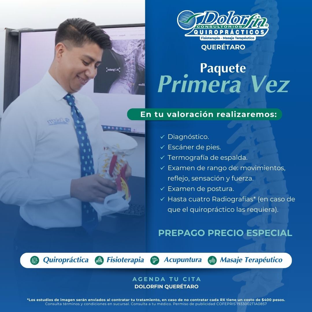 En Dolorfin Quiropráctico Querétaro contamos con la solución a finalizar tu dolor y sentirte bien y subir tu sistema inmunológico. Hemos reservado un examen de 90 minutos, que incluye: